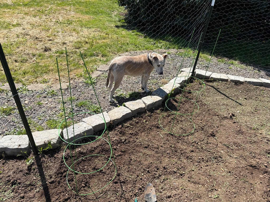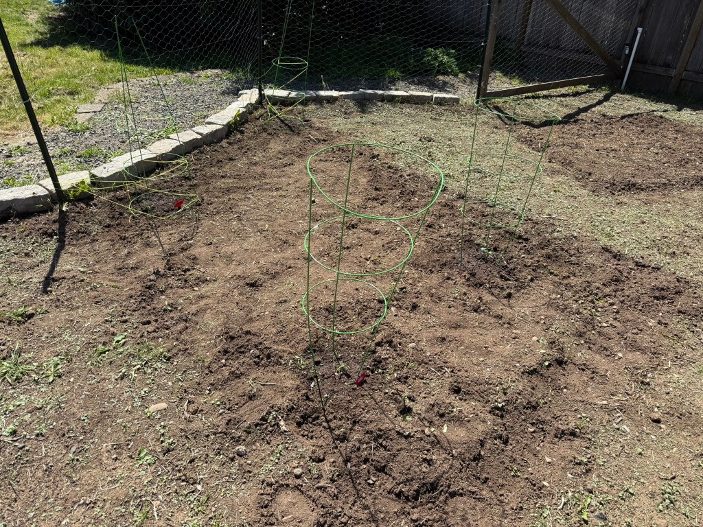 - I flipped two tomato cages upside down and secured them to fence posts for cucumbers