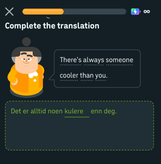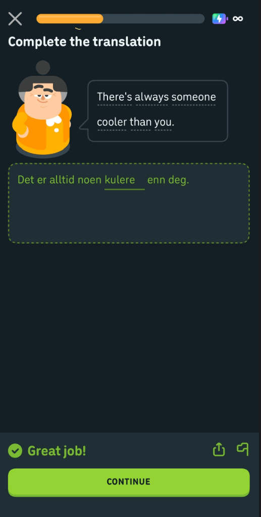 Duolingo isn’t perfect. The hints are questionable, the grammar is mostly implied, and Eddy is still yelling at me. But it’s useful in ways I didn’t expect – it gives me just enough input to start figuring things out for myself.